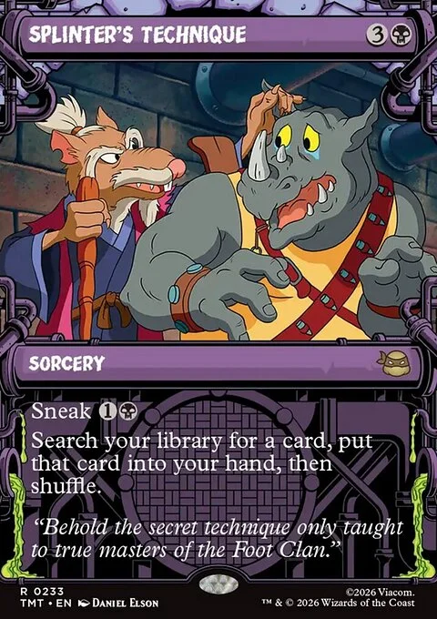 Sneak {1}{B} (You may cast this spell for {1}{B} if you also return an unblocked attacker you control to hand during the declare blockers step.) Search your library for a card, put that card into your hand, then shuffle.