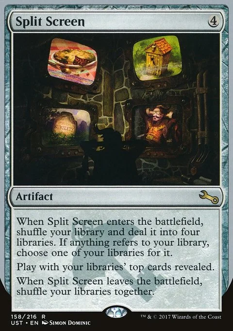 When this artifact enters, shuffle your library and deal it into four libraries. If anything refers to your library, choose one of your libraries for it.