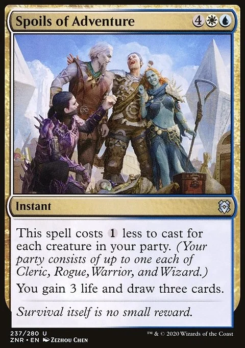 This spell costs {1} less to cast for each creature in your party. (Your party consists of up to one each of Cleric, Rogue, Warrior, and Wizard.) You gain 3 life and draw three cards.