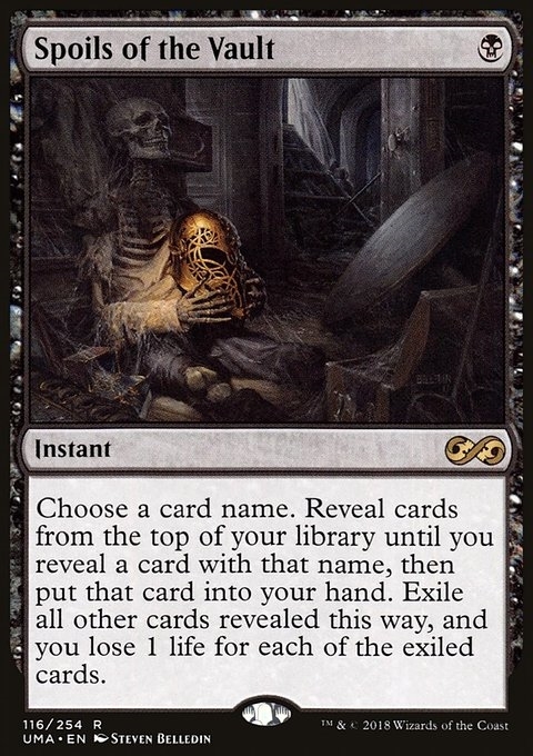 Choose a card name. Reveal cards from the top of your library until you reveal a card with that name, then put that card into your hand. Exile all other cards revealed this way, and you lose 1 life for each of the exiled cards.