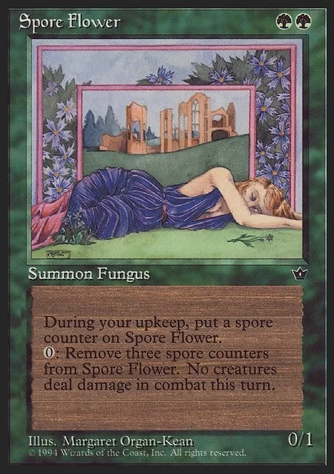 During your upkeep, put a spore counter on Spore Flower.0: Remove three spore counters from Spore Flower. No creatures deal damage in combat this turn.