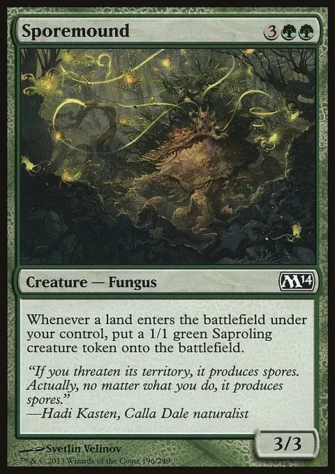 Whenever a land enters the battlefield under your control, create a 1/1 green Saproling creature token.