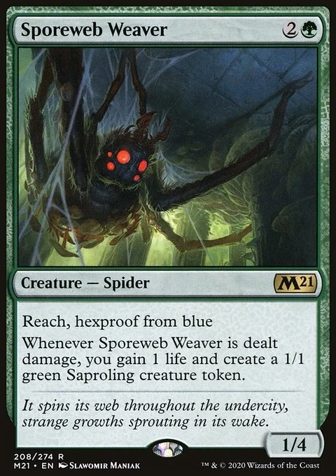 Reach, hexproof from blue Whenever Sporeweb Weaver is dealt damage, you gain 1 life and create a 1/1 green Saproling creature token.