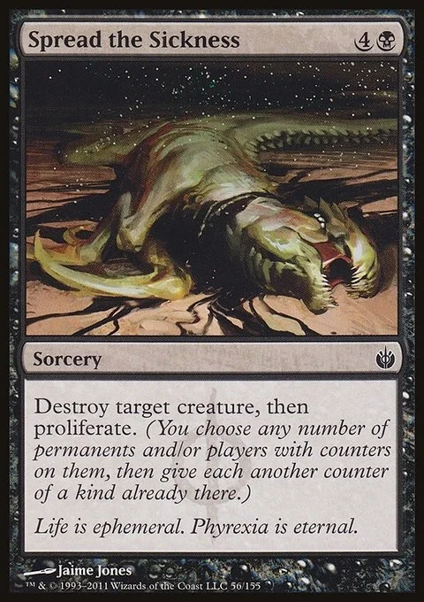 Destroy target creature, then proliferate. (Choose any number of permanents and/or players, then give each another counter of each kind already there.)