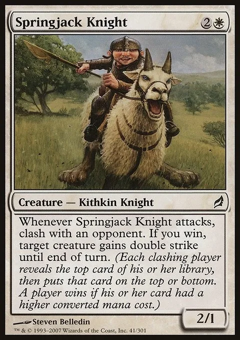 Whenever Springjack Knight attacks, clash with an opponent. If you win, target creature gains double strike until end of turn. (Each clashing player reveals the top card of their library, then puts that card on the top or bottom. A player wins if their card had a higher mana value.)