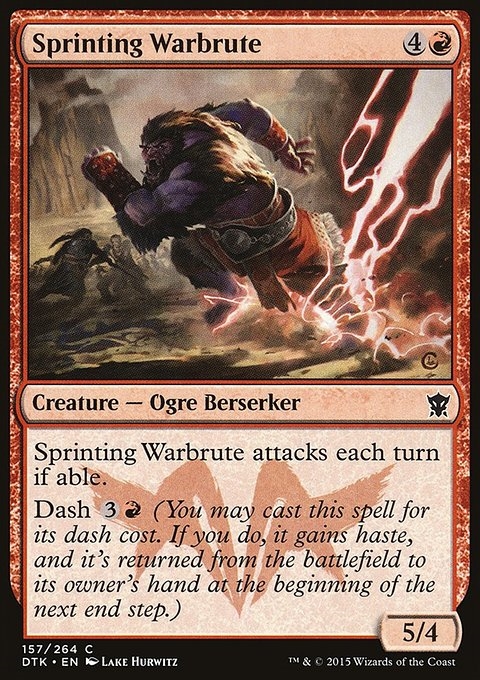 Sprinting Warbrute attacks each combat if able. Dash {3}{R} (You may cast this spell for its dash cost. If you do, it gains haste, and it's returned from the battlefield to its owner's hand at the beginning of the next end step.)