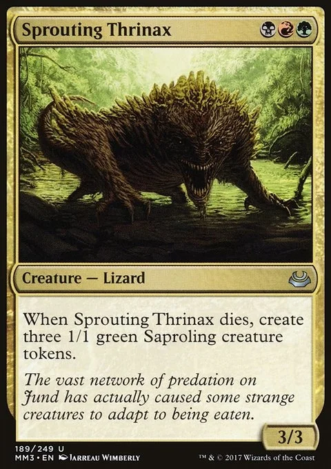 When Sprouting Thrinax dies, create three 1/1 green Saproling creature tokens.