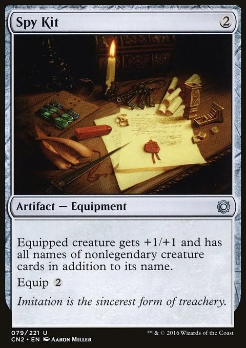 Equipped creature gets +1/+1 and has all names of nonlegendary creature cards in addition to its name.