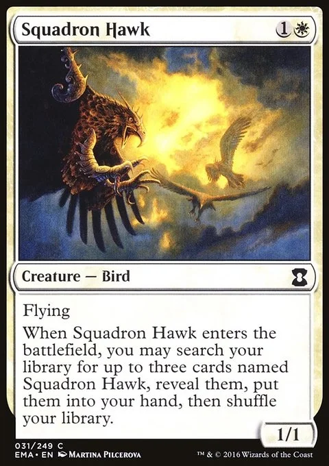 Flying When this creature enters, you may search your library for up to three cards named Squadron Hawk, reveal them, put them into your hand, then shuffle.