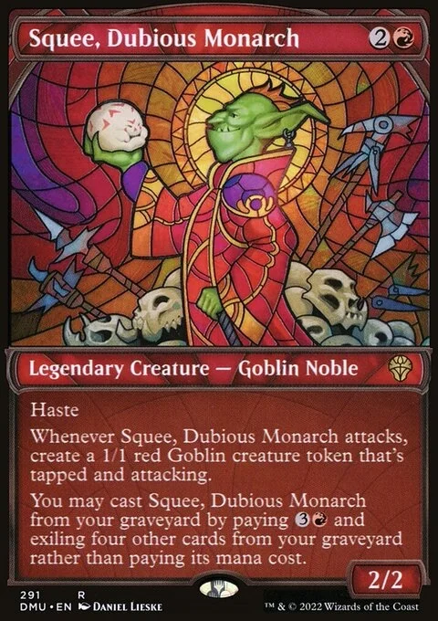 Haste Whenever Squee attacks, create a 1/1 red Goblin creature token that's tapped and attacking. You may cast this card from your graveyard by paying {3}{R} and exiling four other cards from your graveyard rather than paying its mana cost.
