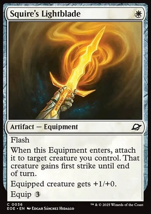 Flash When this Equipment enters, attach it to target creature you control. That creature gains first strike until end of turn. Equipped creature gets +1/+0. Equip {3}