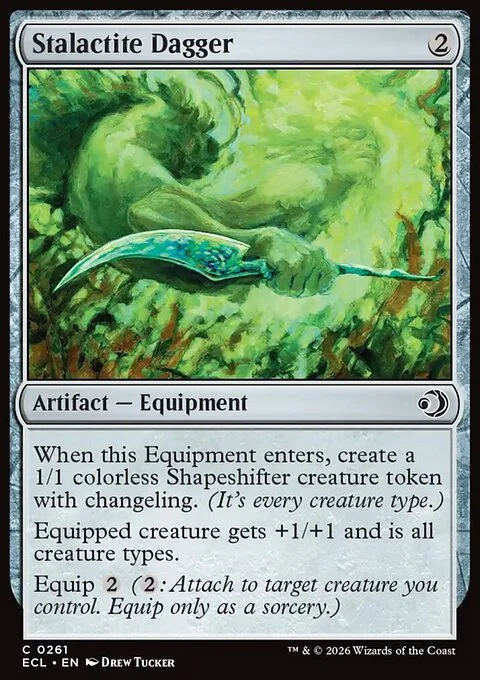 When this Equipment enters, create a 1/1 colorless Shapeshifter creature token with changeling. (It's every creature type.) Equipped creature gets +1/+1 and is all creature types. Equip {2} ({2}: Attach to target creature you control. Equip only as a sorcery.)