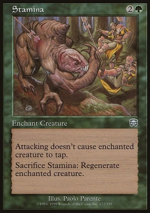 Enchant creature Enchanted creature has vigilance. Sacrifice Stamina: Regenerate enchanted creature.