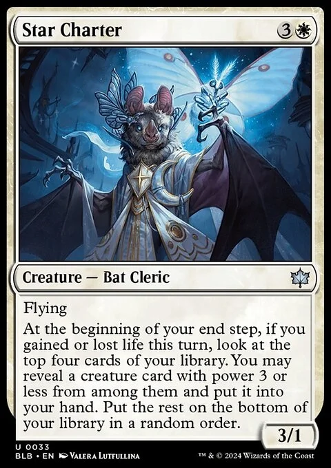 Flying At the beginning of your end step, if you gained or lost life this turn, look at the top four cards of your library. You may reveal a creature card with power 3 or less from among them and put it into your hand. Put the rest on the bottom of your library in a random order.
