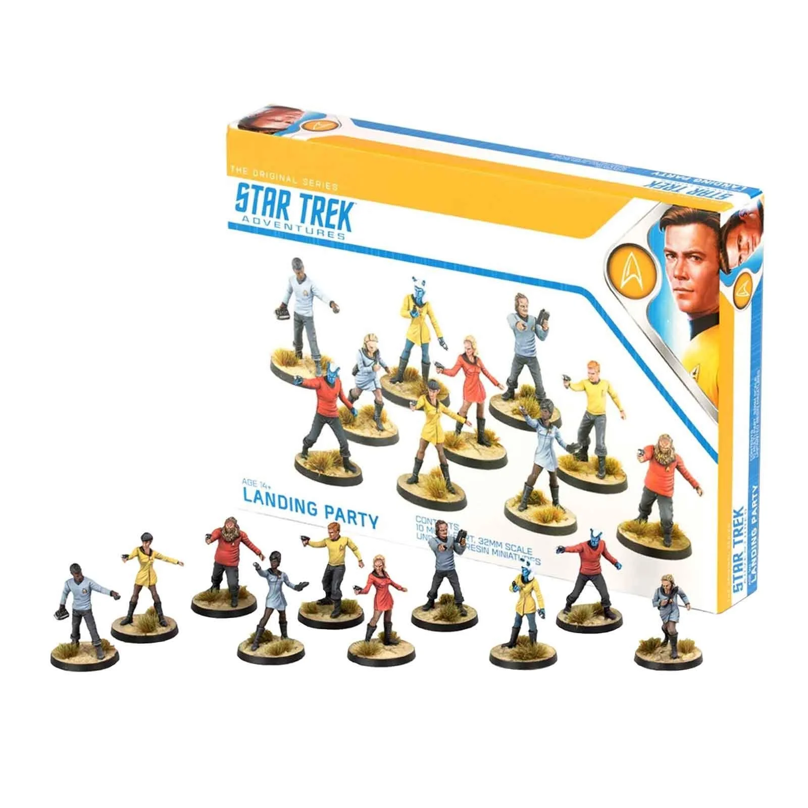 10 highly detailed, 32mm scale, unpainted resin miniatures of an Original Series Starfleet away team for use with Star Trek Adventures the tabletop roleplaying game. This set contains one male officer and one female officer of the Andorian, Denobulan, Tellarite, and Vulcan species, as well as two male humanoid miniatures.