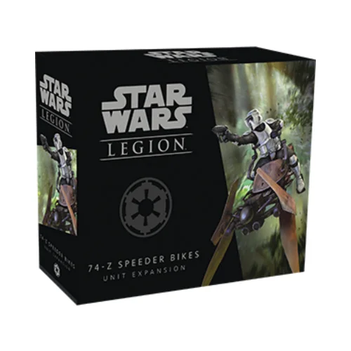 The 74-Z Speeder Bikes Unit Expansion includes a unit of two 74-Z Speeder Bikes, and all the unit cards and upgrade cards you need to expand your forces with these lightning-fast speeders.