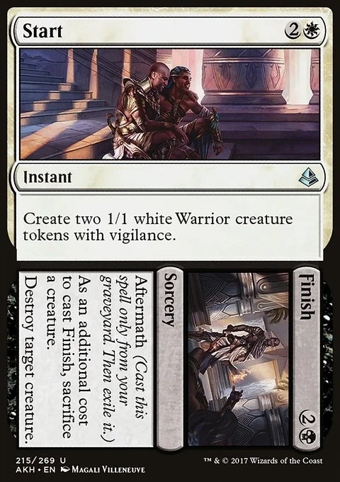 Start Create two 1/1 white Warrior creature tokens with vigilance. Finish Aftermath (Cast this spell only from your graveyard. Then exile it.) As an additional cost to cast Finish, sacrifice a creature. Destroy target creature.