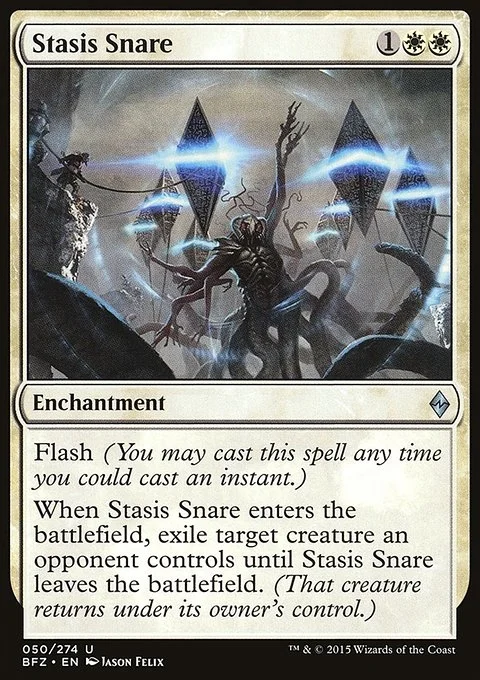 Flash (You may cast this spell any time you could cast an instant.) When Stasis Snare enters the battlefield, exile target creature an opponent controls until Stasis Snare leaves the battlefield. (That creature returns under its owner's control.)