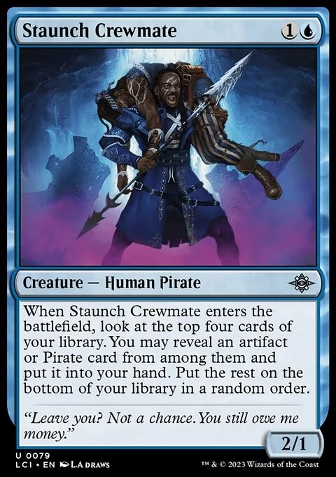 When Staunch Crewmate enters the battlefield, look at the top four cards of your library. You may reveal an artifact or Pirate card from among them and put it into your hand. Put the rest on the bottom of your library in a random order.