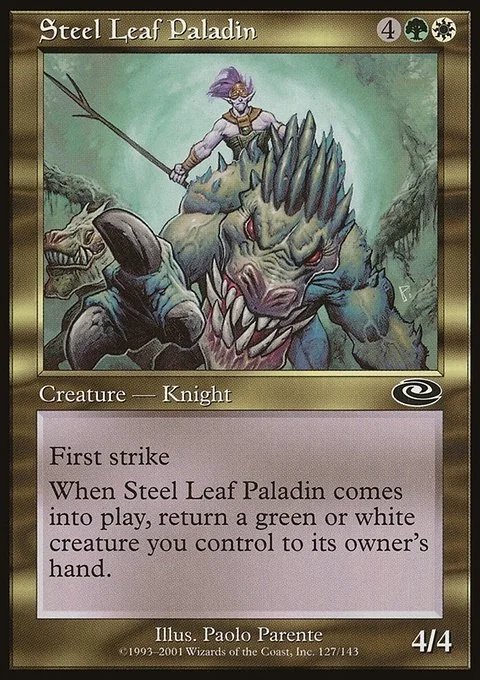 First strike When Steel Leaf Paladin enters the battlefield, return a green or white creature you control to its owner's hand.