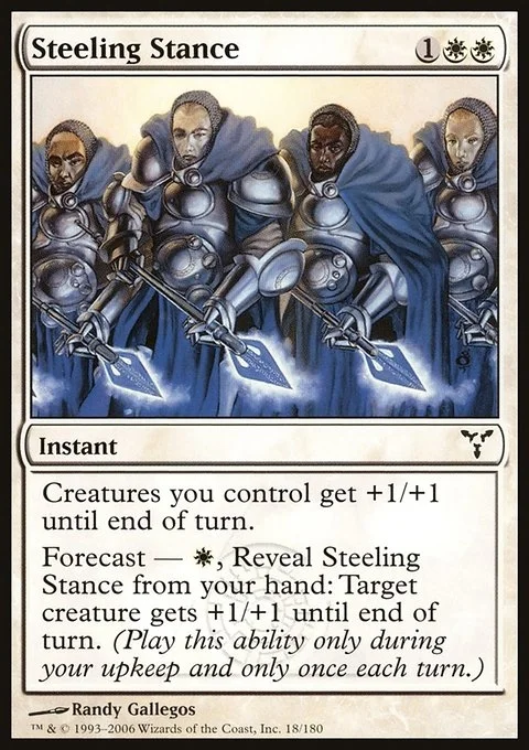 Creatures you control get +1/+1 until end of turn. Forecast — {W}, Reveal Steeling Stance from your hand: Target creature gets +1/+1 until end of turn. (Activate only during your upkeep and only once each turn.)