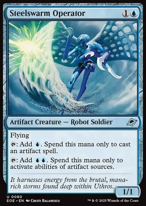 Flying {T}: Add {U}. Spend this mana only to cast an artifact spell. {T}: Add {U}{U}. Spend this mana only to activate abilities of artifact sources.
