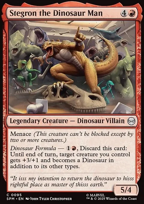 Menace (This creature can't be blocked except by two or more creatures.) Dinosaur Formula — {1}{R}, Discard this card: Until end of turn, target creature you control gets +3/+1 and becomes a Dinosaur in addition to its other types.