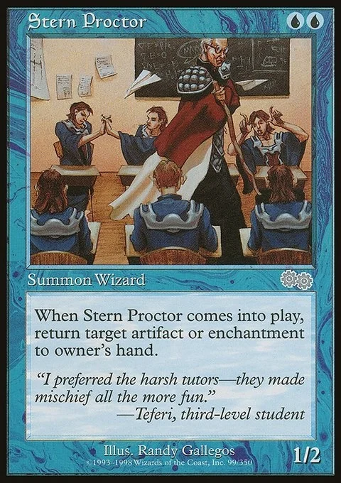 When Stern Proctor comes into play, return target artifact or enchantment to owner’s hand.