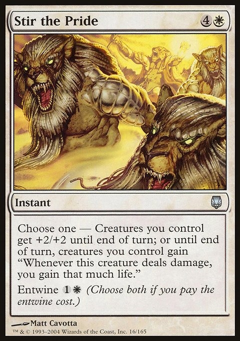 Choose one — • Creatures you control get +2/+2 until end of turn. • Until end of turn, creatures you control gain "Whenever this creature deals damage, you gain that much life." Entwine {1}{W} (Choose both if you pay the entwine cost.)