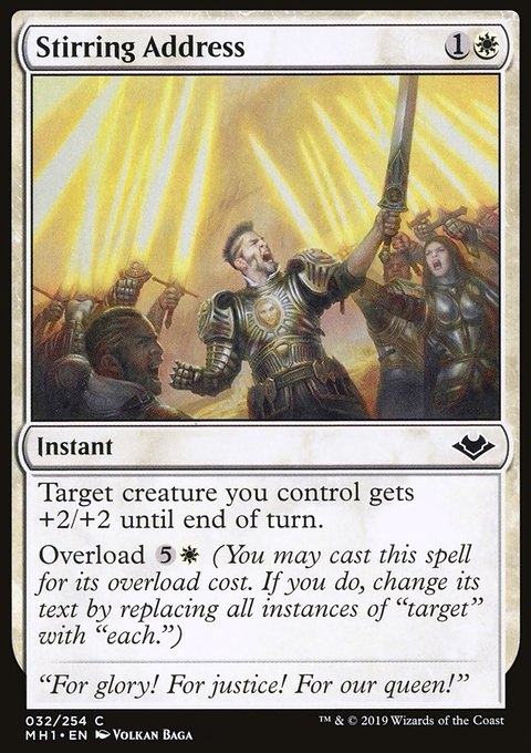 Target creature you control gets +2/+2 until end of turn. Overload {5}{W} (You may cast this spell for its overload cost. If you do, change "target" in its text to "each.")
