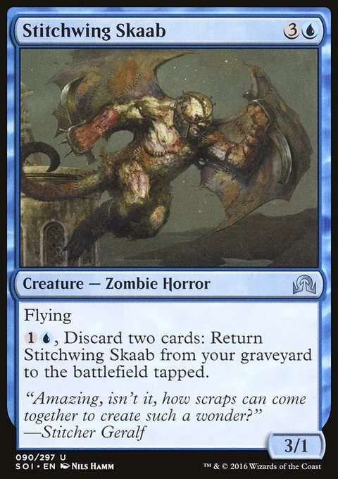 Flying {1}{U}, Discard two cards: Return Stitchwing Skaab from your graveyard to the battlefield tapped.