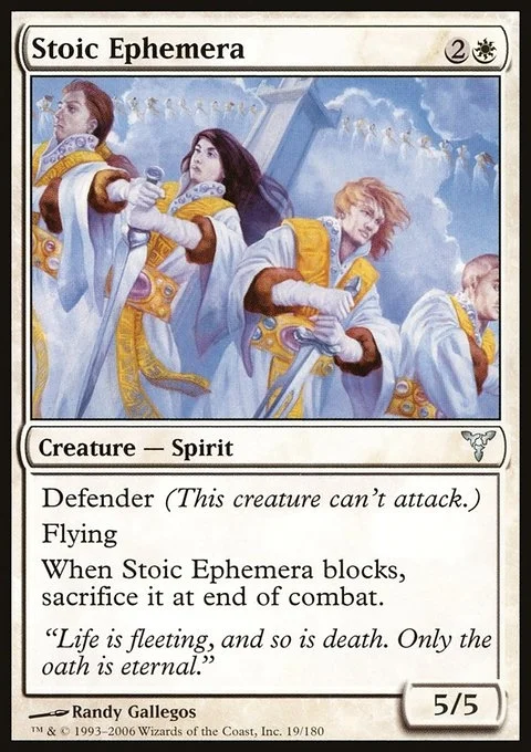 Defender (This creature can't attack.) Flying When Stoic Ephemera blocks, sacrifice it at end of combat.