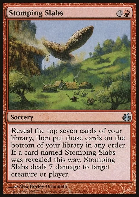 Reveal the top seven cards of your library, then put those cards on the bottom of your library in any order. If a card named Stomping Slabs was revealed this way, Stomping Slabs deals 7 damage to target creature or player.