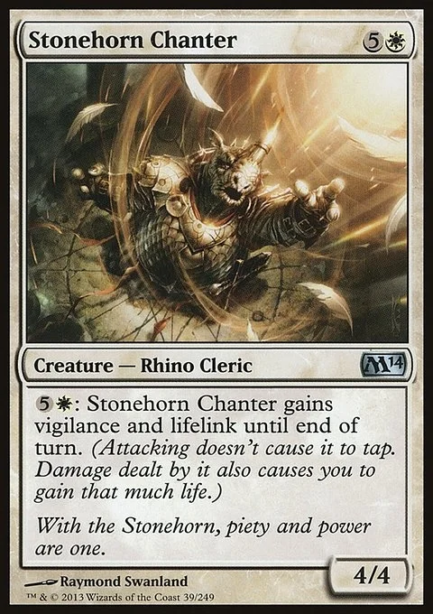 {5}{W}: Stonehorn Chanter gains vigilance and lifelink until end of turn. (Attacking doesn't cause it to tap. Damage dealt by it also causes you to gain that much life.)