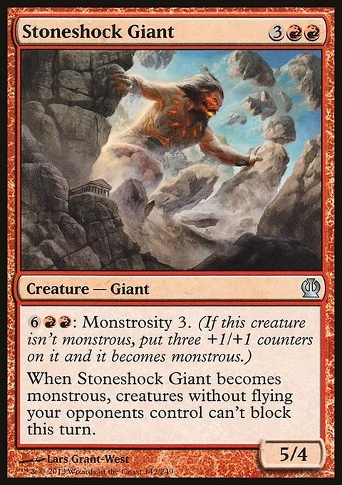 {6}{R}{R}: Monstrosity 3. (If this creature isn't monstrous, put three +1/+1 counters on it and it becomes monstrous.) When Stoneshock Giant becomes monstrous, creatures without flying your opponents control can't block this turn.