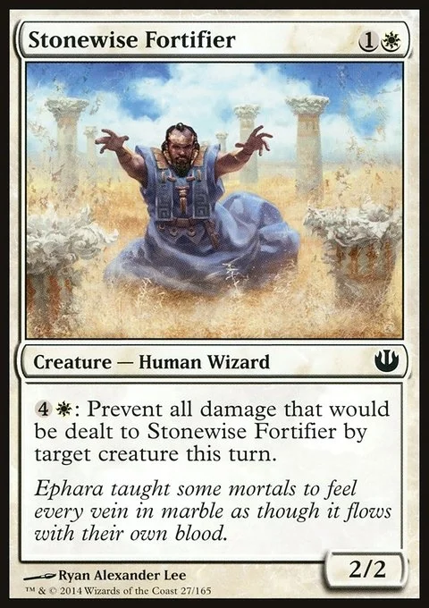 {4}{W}: Prevent all damage that would be dealt to Stonewise Fortifier by target creature this turn.