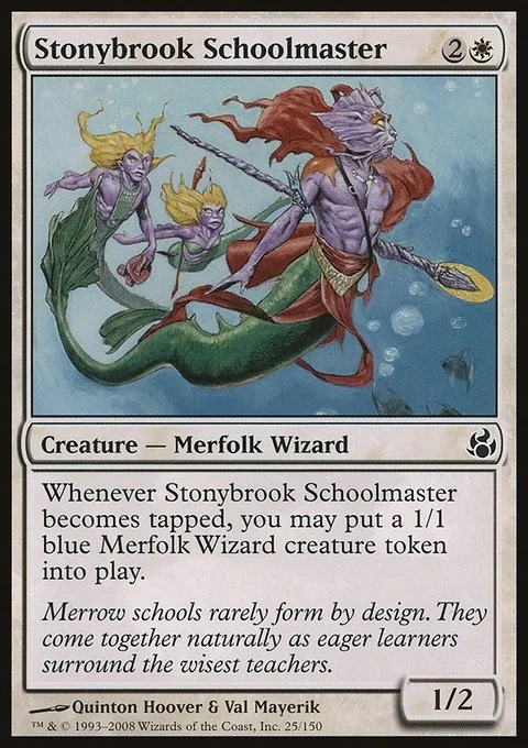 Whenever Stonybrook Schoolmaster becomes tapped, you may create a 1/1 blue Merfolk Wizard creature token.