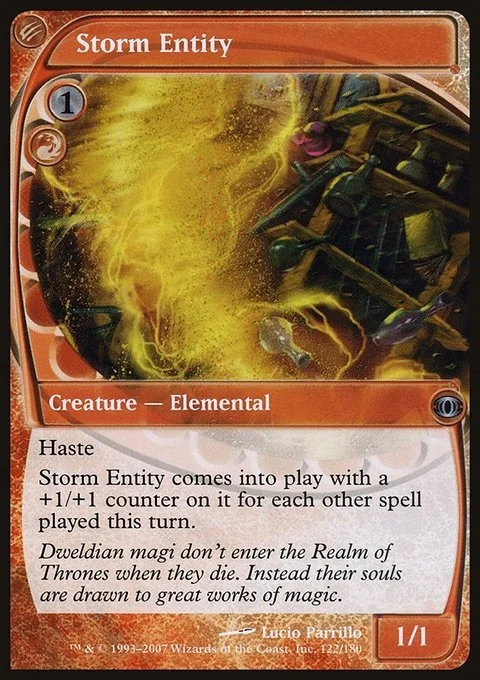 Storm Entity comes into play with a +1/+1 counter on it for each other spell played this turn.