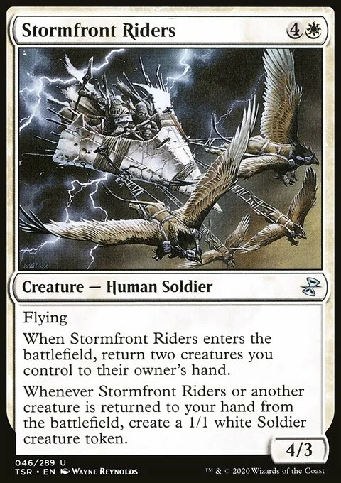 Flying When Stormfront Riders enters the battlefield, return two creatures you control to their owner's hand. Whenever Stormfront Riders or another creature is returned to your hand from the battlefield, create a 1/1 white Soldier creature token.