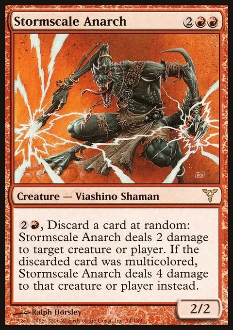 {2}{R}, Discard a card at random: Stormscale Anarch deals 2 damage to any target. If the discarded card was multicolored, Stormscale Anarch deals 4 damage instead.