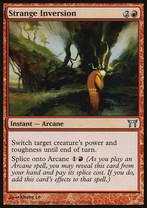 Switch target creature's power and toughness until end of turn. Splice onto Arcane {1}{R} (As you cast an Arcane spell, you may reveal this card from your hand and pay its splice cost. If you do, add this card's effects to that spell.)