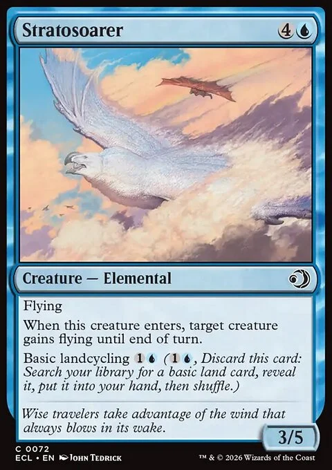 Flying When this creature enters, target creature gains flying until end of turn. Basic landcycling {1}{U} ({1}{U}, Discard this card: Search your library for a basic land card, reveal it, put it into your hand, then shuffle.)