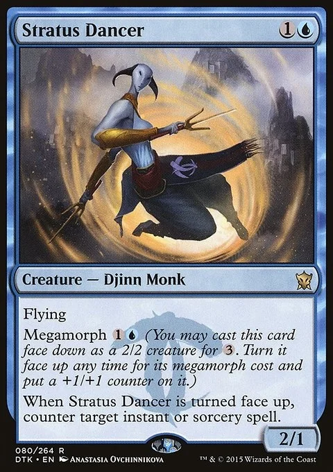 Flying Megamorph {1}{U} (You may cast this card face down as a 2/2 creature for {3}. Turn it face up any time for its megamorph cost and put a +1/+1 counter on it.) When Stratus Dancer is turned face up, counter target instant or sorcery spell.