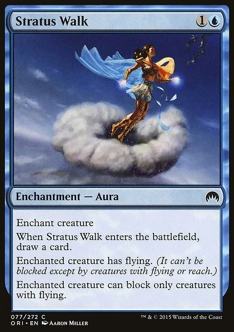 Enchant creature When Stratus Walk enters the battlefield, draw a card. Enchanted creature has flying. (It can't be blocked except by creatures with flying or reach.) Enchanted creature can block only creatures with flying.