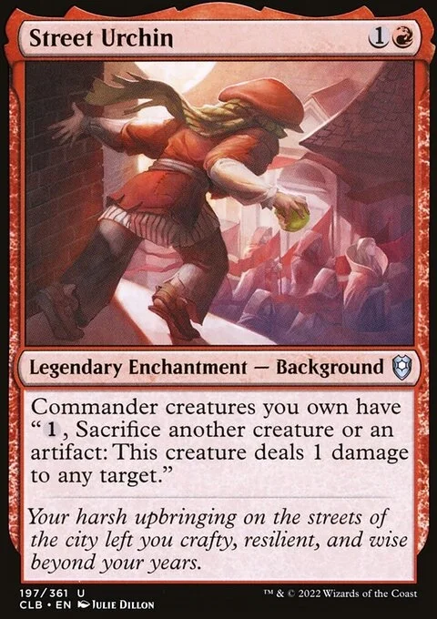 Commander creatures you own have "{1}, Sacrifice another creature or an artifact: This creature deals 1 damage to any target."