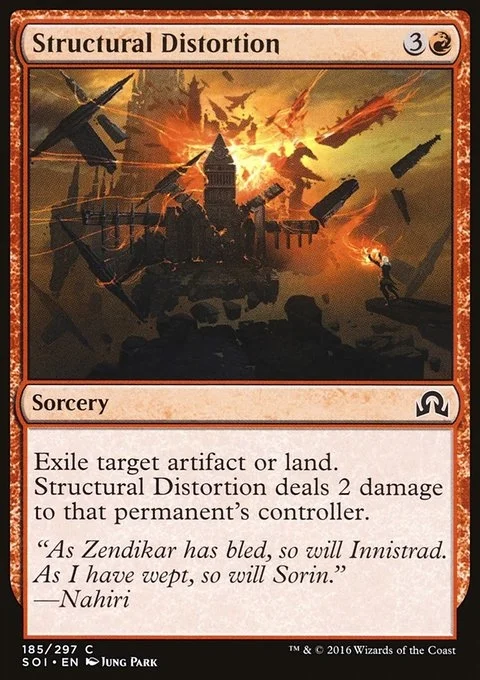 Exile target artifact or land. Structural Distortion deals 2 damage to that permanent's controller.