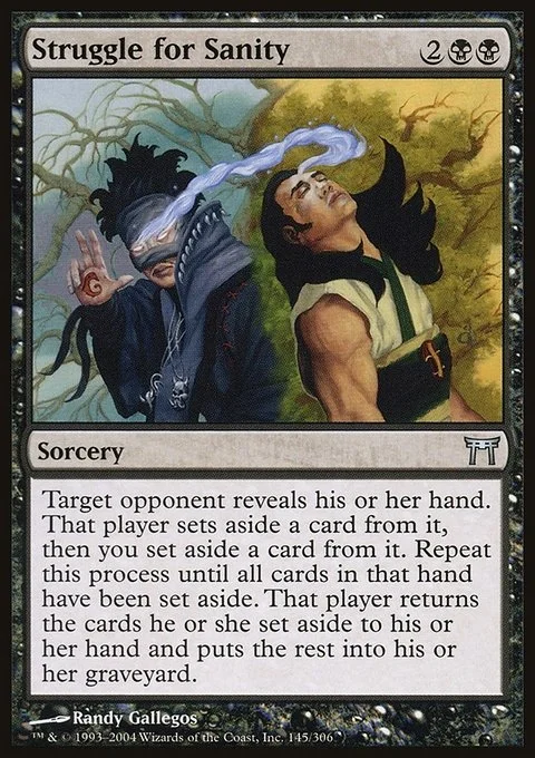 Target opponent reveals their hand. That player exiles a card from it, then you exile a card from it. Repeat this process until all cards in that hand have been exiled. That player returns the cards they exiled this way to their hand and puts the rest into their graveyard.