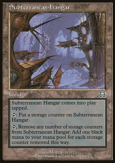Subterranean Hangar enters the battlefield tapped. {T}: Put a storage counter on Subterranean Hangar. {T}, Remove any number of storage counters from Subterranean Hangar: Add {B} for each storage counter removed this way.