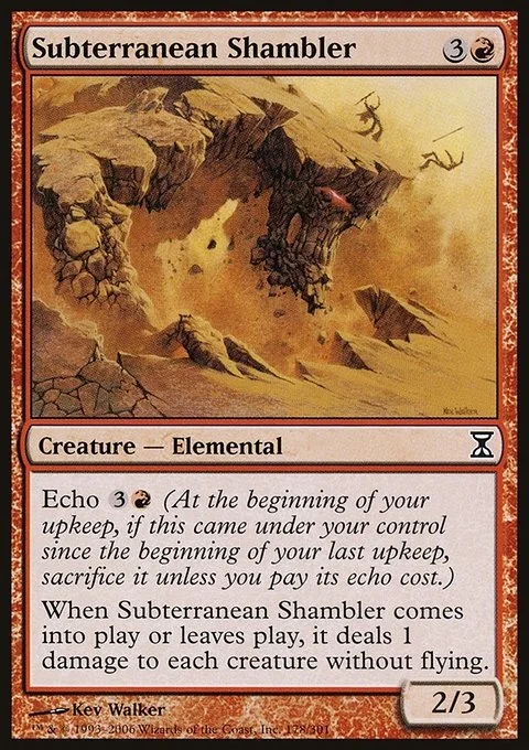 When Subterranean Shambler enters or leaves the battlefield, it deals 1 damage to each creature without flying.
