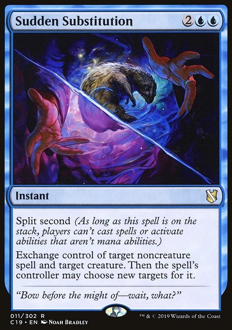 Exchange control of target noncreature spell and target creature. Then the spell's controller may choose new targets for it.